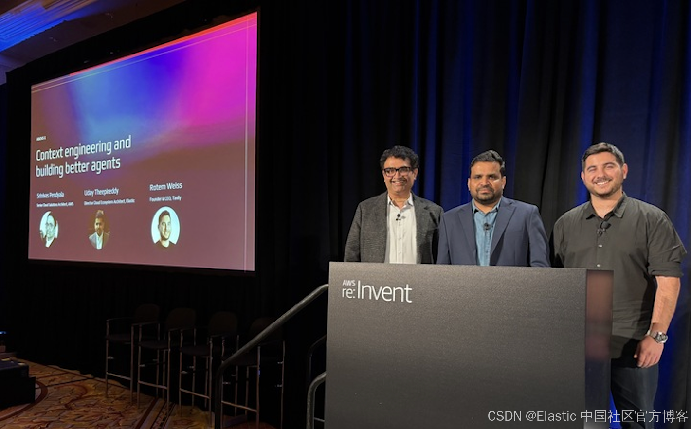 最后,Elastic 搜索业务总经理 Steve Kearns 与 AWS 生成式 AI 高级架构师 Ayan Ray 一同参加了 AWS AI LIVE! 活动。他们讨论了如何使用上下文工程构建 AI 代理、向量搜索中相关性与可扩展性的重要性,以及 Elastic Agent Builder 的应用。