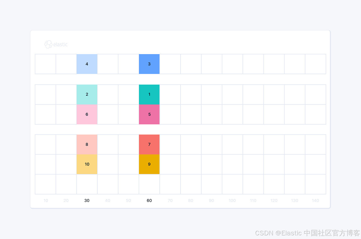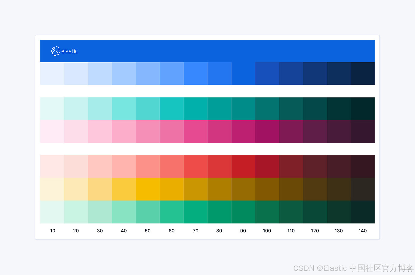 我们选择了一个 10 色配色方案,由五种不同色调(青色、Elastic 蓝、粉色、红色和黄色)的成对色阶组成(shade 60 和 shade 30,或列 60 和 30)。