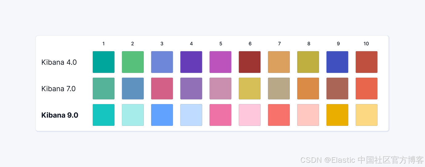 Kibana 数据可视化的新配色方案于 2024 年 11 月在 Serverless 中进行了提前测试,并于 2025 年 4 月在 Kibana 9.0 中作为默认设置引入。