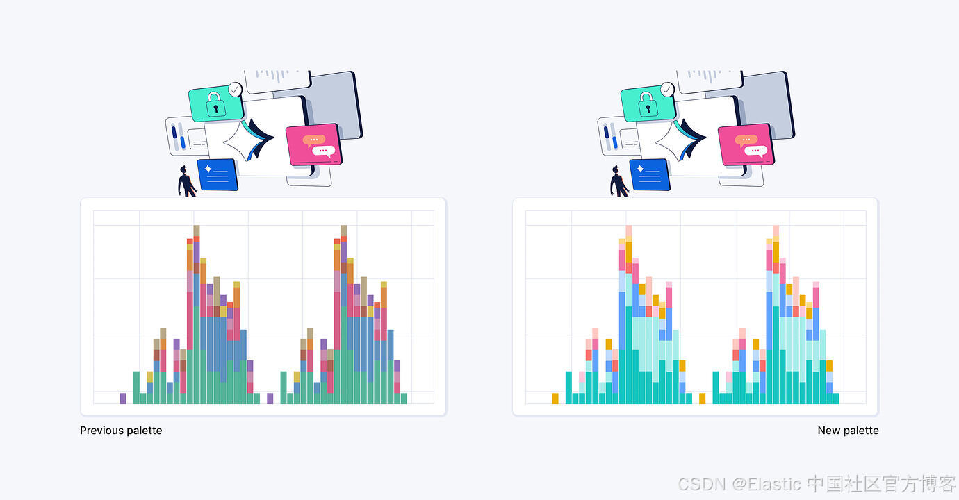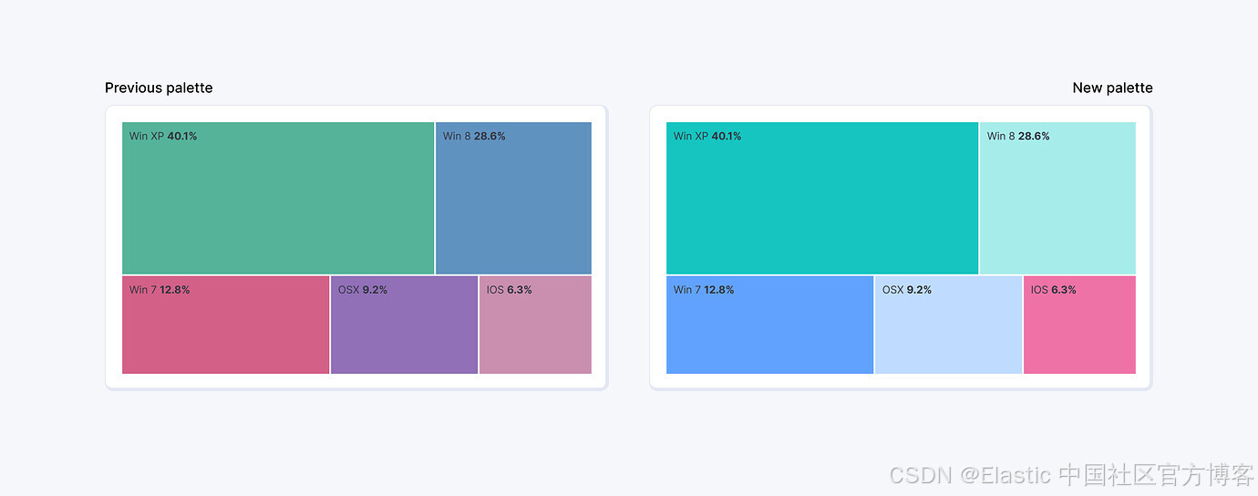 如下图所示,此次更新将我们的图表从左侧示例转变为右侧示例。这是在查看 Kibana 可视化时最明显的变化:颜色更亮、更均匀分布,即使使用的色调更少,但这只是变化的表面。接下来,让我们深入了解这些颜色是如何以及为何被选用的。