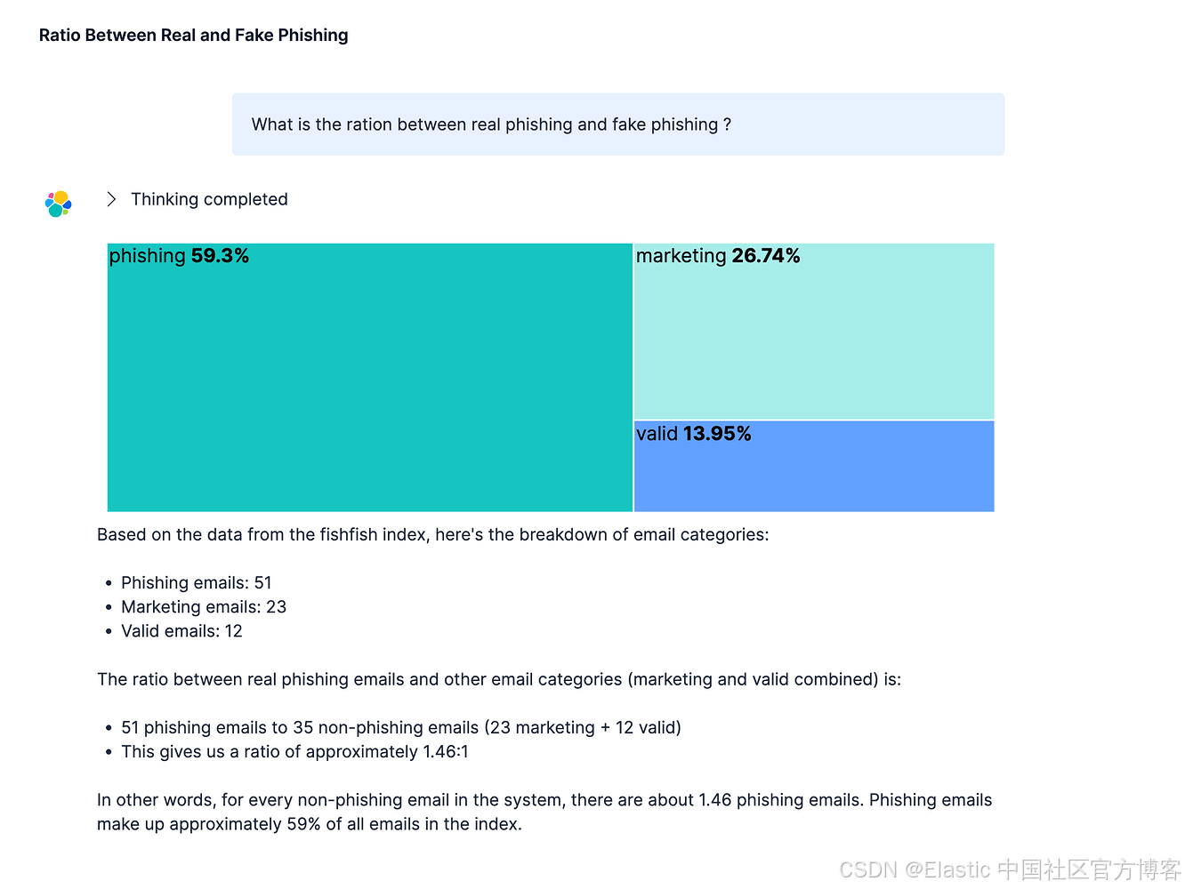 Agent Builder 查询 “What is the ration between real phishing and fake phishing?” 显示了整体邮件组成: