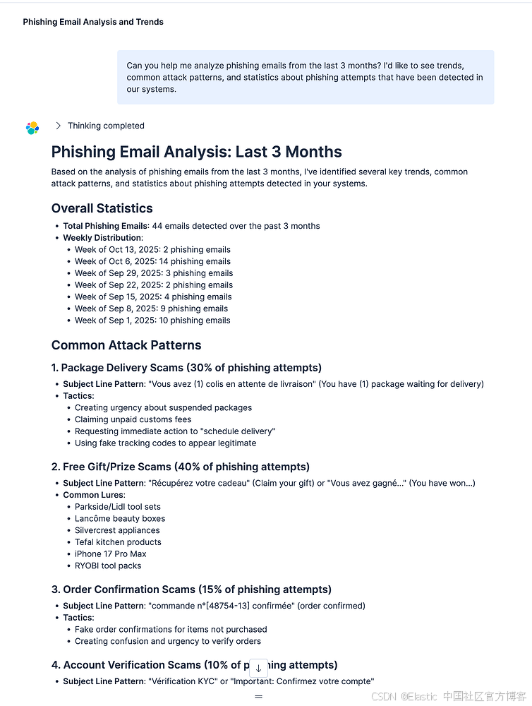 钓鱼攻击仍然主导着网络安全威胁形势,攻击者越来越多地使用复杂的社会工程技术来绕过传统过滤器。作为一名使用 Elastic 技术的安全从业者,我构建了一个自动化的钓鱼检测与分析系统,将 n8n 工作流自动化与 Elastic 的 AI 驱动的 Agent Builder 相结合。本文将介绍该系统的架构、实现方式,以及对三个月内 44 封钓鱼邮件进行分析所获得的真实洞察。