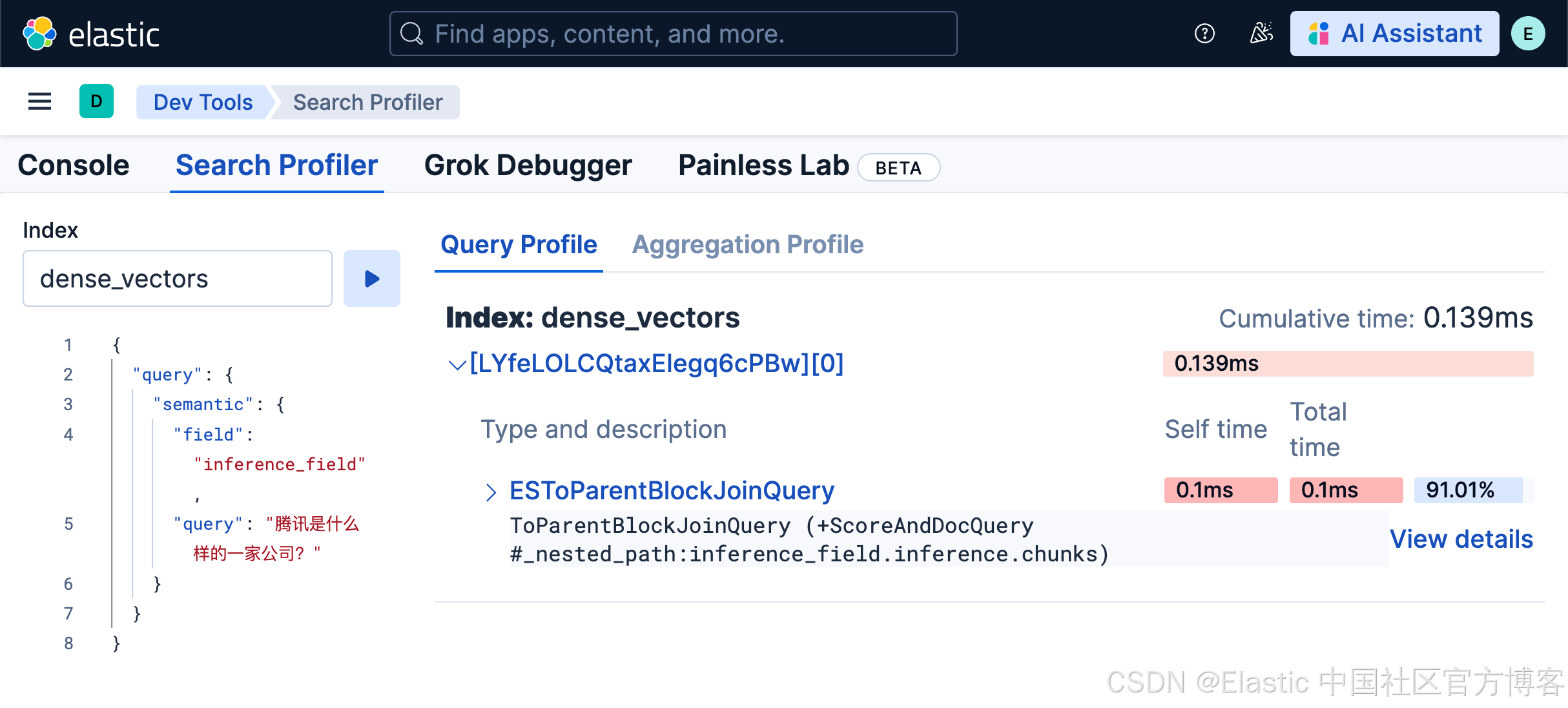 Profile API 是 Elasticsearch 提供的一个调试工具,用于衡量查询执行性能。该 API 会拆解查询执行过程,展示在搜索各个阶段花费的时间。这种可见性在识别瓶颈以及对比不同查询和索引配置时非常有用。