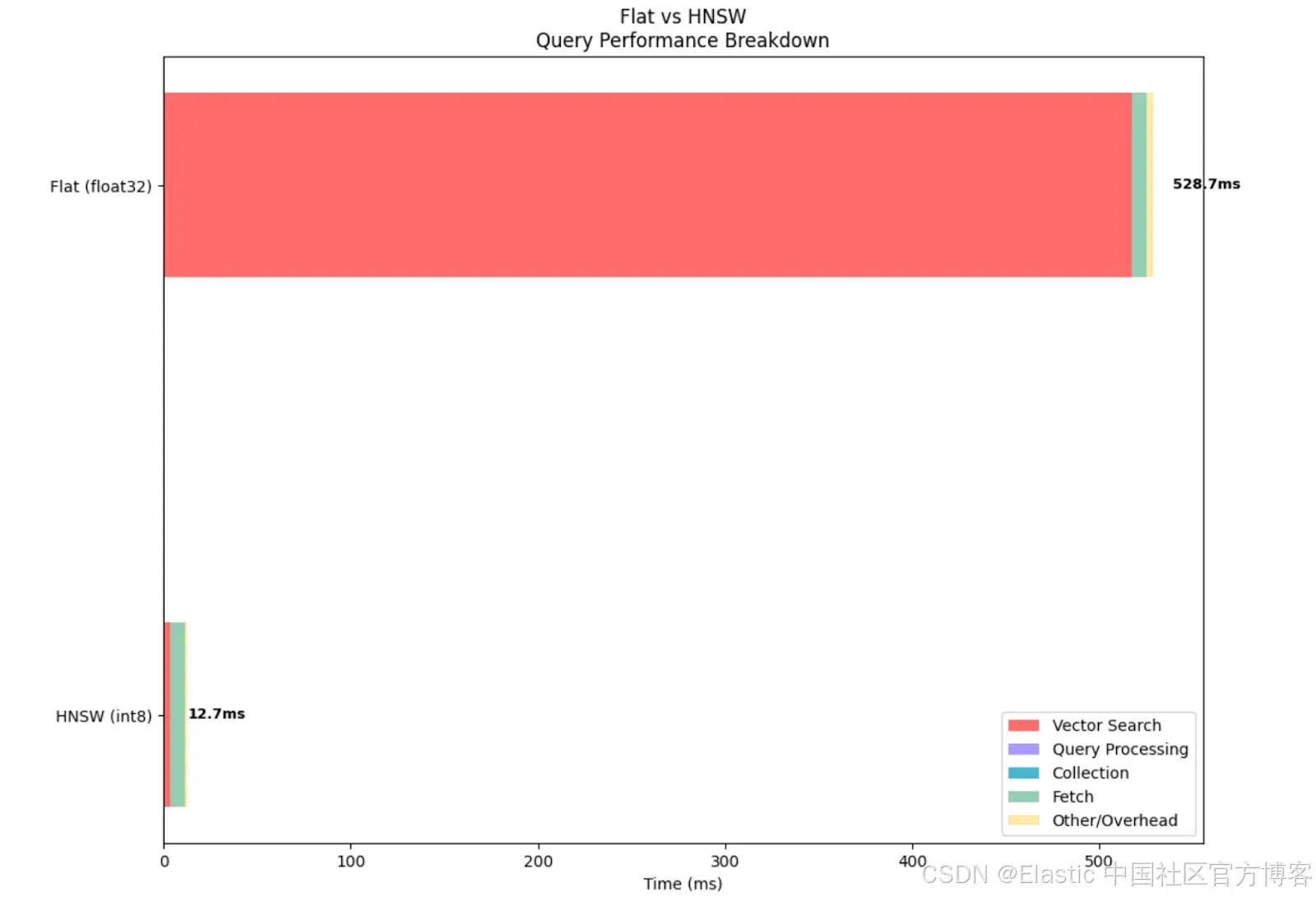 搜索 profiling 可以让我们深入了解查询的执行过程,并据此进行对比分析。这为全面分析和设计决策提供了可能。在我们的实验中,我们可以看到不同 dense vector 配置之间的差异,并得出复杂的洞察。