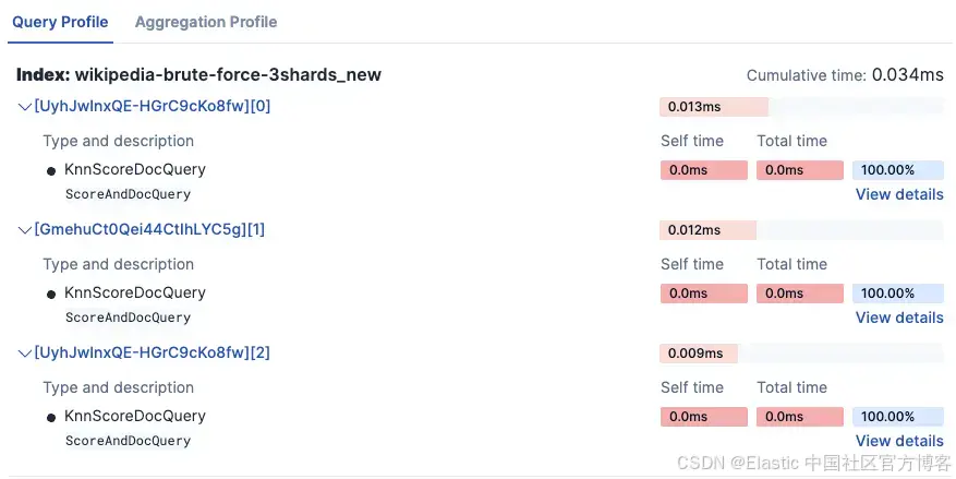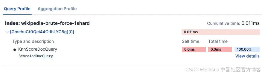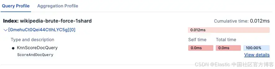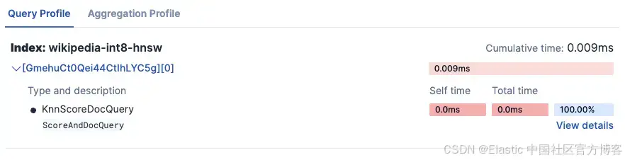 我们可以在 profile 的 dfs 部分找到 KNN 指标。它展示了查询、rewrite 和 collector 各阶段的执行时间;同时还显示了查询中执行的向量操作数量。