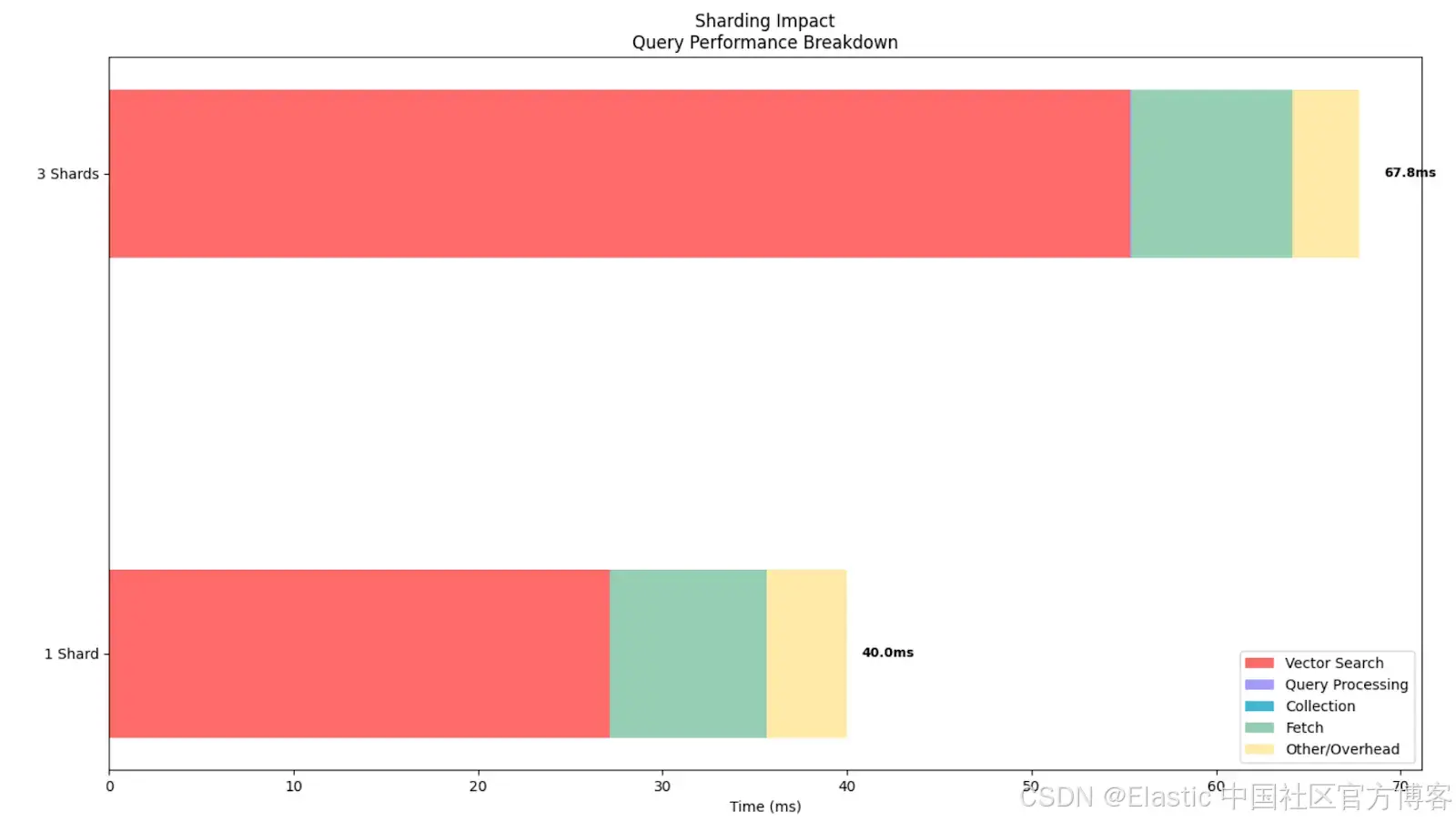 可以看到,即使执行的向量操作数量完全相同,对于这个特定数据集,分片过多会增加向量搜索时间,总体上使查询变慢。这表明我们的分片策略必须与集群架构紧密配合。
