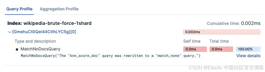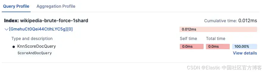 - 假设:当应用过滤器时,Elasticsearch 会先剪掉不匹配过滤条件的文档,再对匹配文档执行耗时的向量搜索。Profile API 会显示向量搜索操作实际搜索的文档数量明显少于索引中的总文档数,从而加快查询速度。