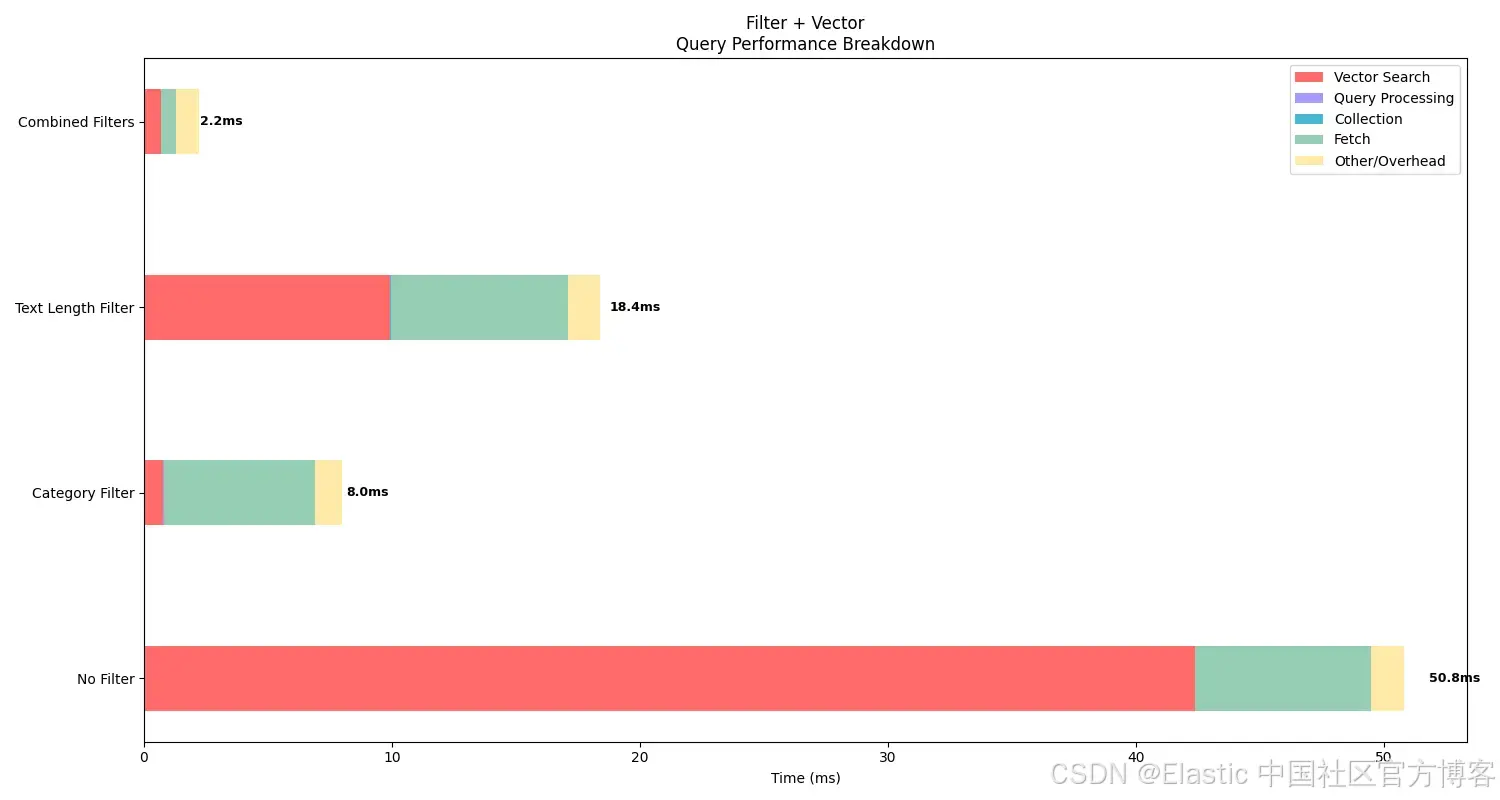 可以看到,应用过滤器会增加搜索的 fetch 时间,但作为交换,它显著减少了向量搜索时间,因为执行的向量操作更少。这展示了 Elasticsearch 如何在向量搜索前先进行过滤,从而提升性能,避免在未过滤掉无关文档前就执行向量搜索而浪费资源。