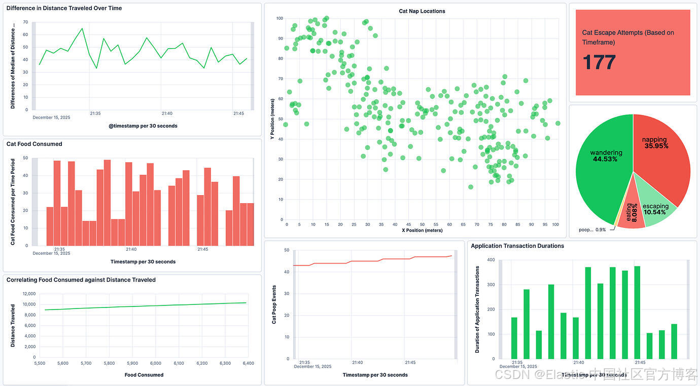在中央,使用 Vega 作为自定义可视化,散点图显示了 MeowPy 最喜欢的午睡地点,通过绘制它喜欢睡觉的 x 和 y 坐标来展示。在右上角,一个指标显示猫的逃跑尝试次数,并对框的颜色应用条件格式,当尝试次数高时立即提醒用户。下方是一个饼图,展示 MeowPy 的日常习惯——可以看到,它在节日期间相当活跃。饼图下方的条形图显示的是应用指标,而不是猫的指标:应用事务的持续时间。