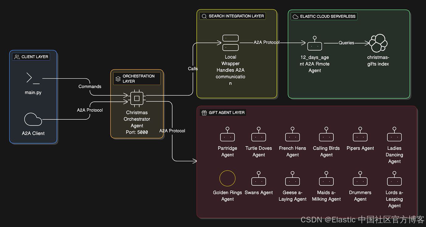 12-days-of-a2a 项目是一个非常简单但很有力量的演示,用来展示 Google 的 Agent-to-Agent( A2A )协议,并使用《 Twelve Days of Christmas 》作为数据集。圣诞节的每一天都有一个专门的 agent,全部由一个主 orchestrator agent 进行协调。我们还集成了 Elastic 全新的 Agent Builder 服务,用来展示远程 agent 如何加入这场节日派对。