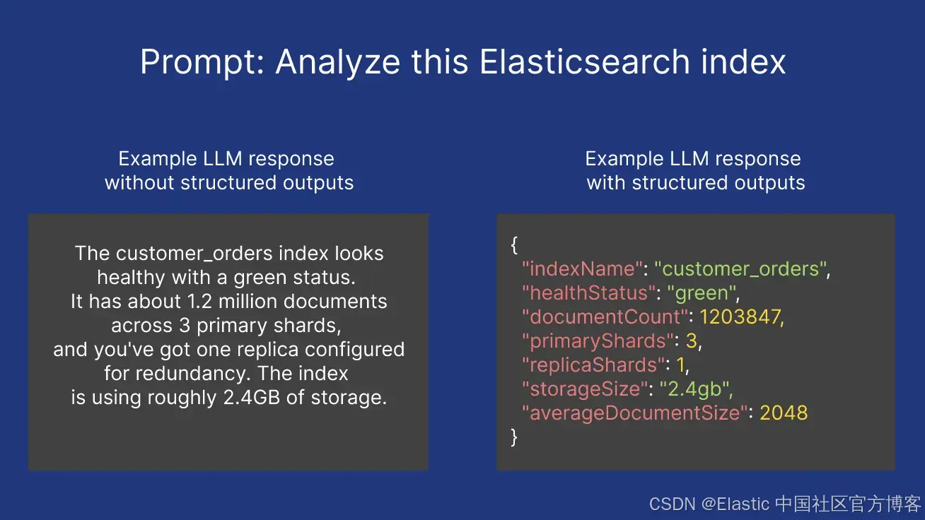 在下面的示例中,如果你让一个 LLM 访问你在 Elasticsearch 中的 indices,并要求它 “分析这个 Elasticsearch index”,它很可能会返回一段叙述性的解释,而且每次你用相同的 prompt 询问,结果都会变化。使用 structured outputs,你可以请求一个包含特定字段的响应,比如 indexName、documentCount、healthStatus 等,每个字段都有定义好的类型和校验规则。