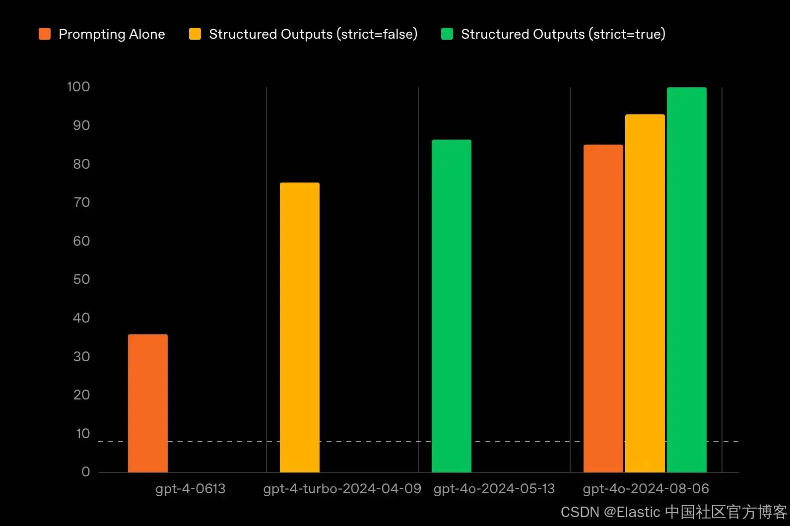主要的模型提供商正在迅速注意到结构化输出变得多么重要,Google、OpenAI 和 Anthropic 都已经在各自的 API 中发布了对结构化输出的支持。OpenAI 更进一步,发布了经过专门训练的新模型,能够更好地理解并遵循复杂的 schema。下面是 OpenAI 对其模型在遵循复杂 JSON schema 方面表现的评估。