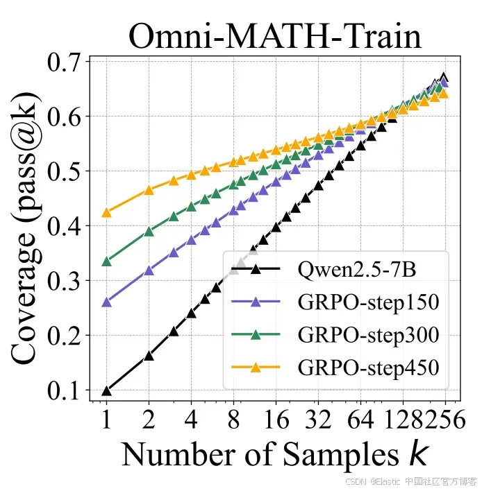 作者的测试方法是评估在给定不同尝试次数的情况下,模型对一组问题的正确答案数量。每次尝试都是在生成过程中采样一个答案。他们比较了模型在不同 RLVR 训练 epochs 后的表现。结果显示,训练显著提高了模型在只有一次或少数机会时的答案准确率,但在多次尝试时效果不明显。这表明他们提高了得到正确答案的概率,但并没有真正提升模型的推理能力。