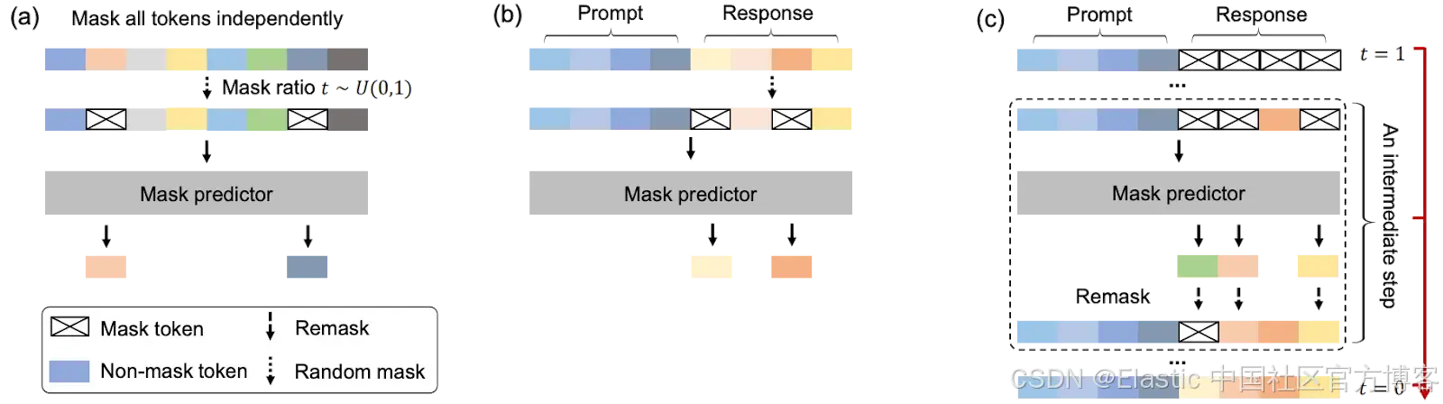 (c) Sampling:LLaDA 模拟一个从 t = 1(完全 masked)到 t = 0(unmasked)的 diffusion 过程,每一步同时预测所有 masks,并使用灵活的 remask 策略。