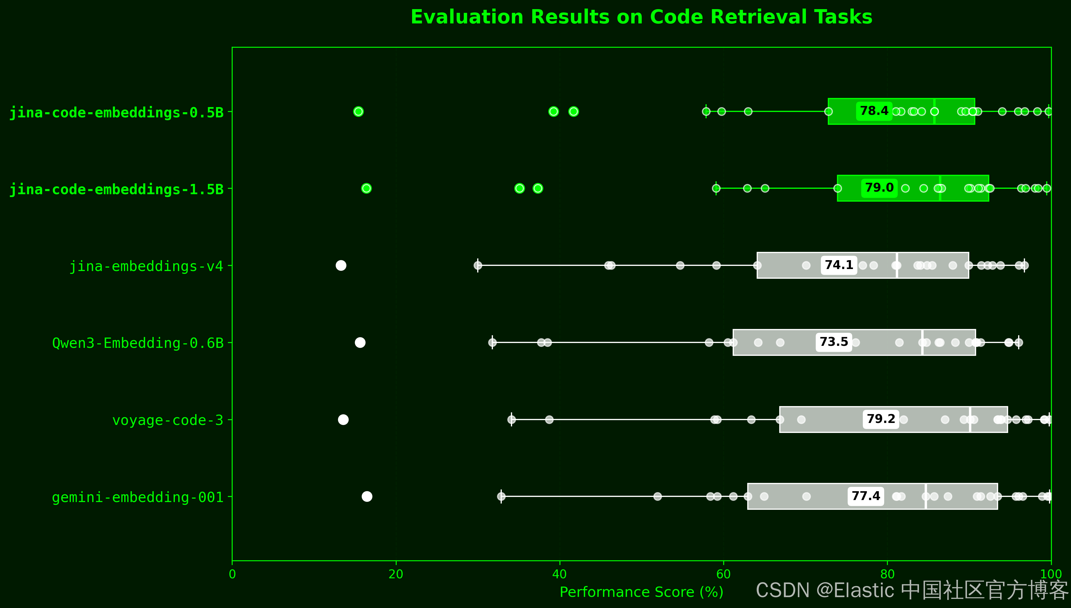 jina-code-embeddings 在 25 个代码检索基准上平均性能分别为 78.41%(0.5B)和 79.04%(1.5B)。0.5B 模型比 Qwen3-Embedding-0.6B 高 5 个百分点,尽管体积小 20%;1.5B 版本的性能与 voyage-code-3(79.23%)相当,并超过 gemini-embedding-001(77.38%)—— 这两个都是架构未公开的专有模型。