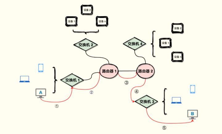 假设计算机 A 和计算机 B 在上述的网络拓扑图(不在同一局域网)中。可以很清晰地看到 计算机 A 和 计算机