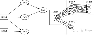 · 拓扑(topologies):可以比作Hadoop上的MapReduce jobs,主要的区别在于MapReduce jobs早晚会结束,而topologies永无休止(流数据的无边界特征),每个拓扑由一系列的Spout和Bolt构成,见下图左👇。
