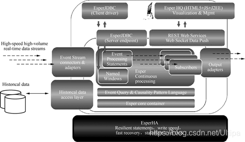 而我们要关注的Esper则对以上两种方案兼而有之,它是EsperTech公司的CEP产品,整体架构有三大组件,见下图👇:EsperEE设计架构图