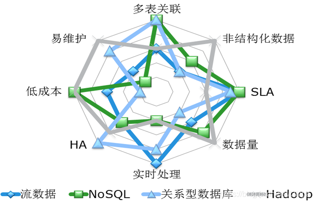 最后,作为本节的总结,我们从可靠性、运维、成本、实时性、数据规模等维度考察NoSQL、Hadoop、RDBMS与流处理架构,它们的优劣比较如下图所示👇。