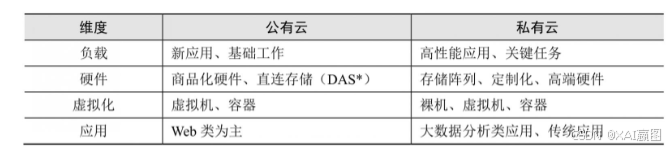 图1-20中描绘的是一个典型的混合云架构,我们用表1-3来说明公有云和私有云在一个混合云架构上各自的侧重点。