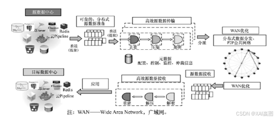 图1-21展示的是一个典型的从源数据中心向目标数据中心通过分布式数据分发、P2P公共网络传输数据的架构。该架构意图达到高效、可靠、分布式数据传输的效果,同样适用于基础架构迁移的场景。