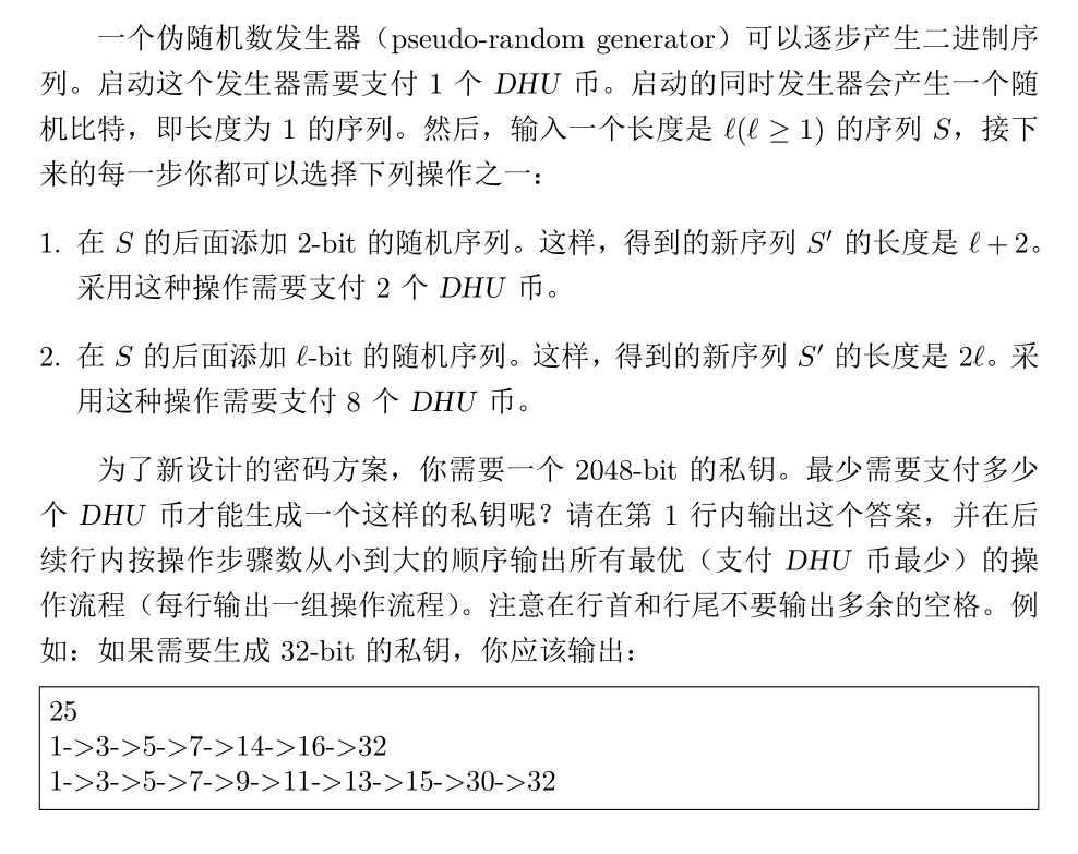 cout<<"1->3->5->7->9->11->13->15->30->32->64->128->256->512->1024->2048" << endl;