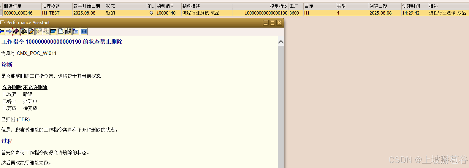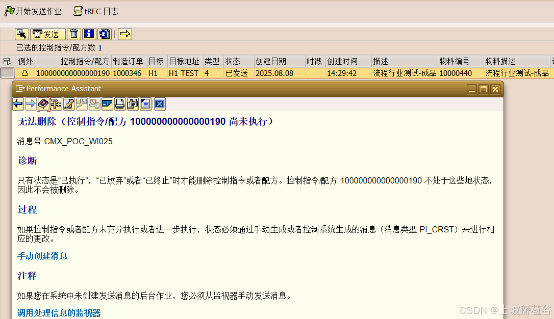 订单生成控制配方后,在控制配方监视器(CO53XT)是无法直接删除的