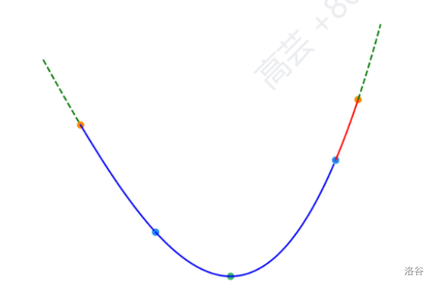 基本逻辑类似,假设 x x x 的函数值为 f ( x ) f(x) f(x),对于当前区间 [ L , R ] [L,R] [L,R](红点之间的部分),我们在区间内任取两点 m L , m R ( m L < m R ) mL,mR\ (mL<mR) mL,mR (mL<mR)(两个蓝色的点);如果 f ( m L ) < f ( m R ) f(mL)<f(mR) f(mL)<f(mR),则在 [ m R , R ] [mR,R] [mR,R](红色部分)中函数值必然单调递增,最值(绿点)必然不在这一区间。每一轮都会舍去两侧区间中的其中一个。为减少三分的次数,可以让 m L ← m i d − eps , m R ← m i d + eps mL\gets mid-\text{eps},mR\gets mid+\text{eps} mL←mid−eps,mR←mid+eps,其中 eps \text{eps} eps 为一个很小的值。复杂度和 log 2 n \log_2n log2n 十分接近。