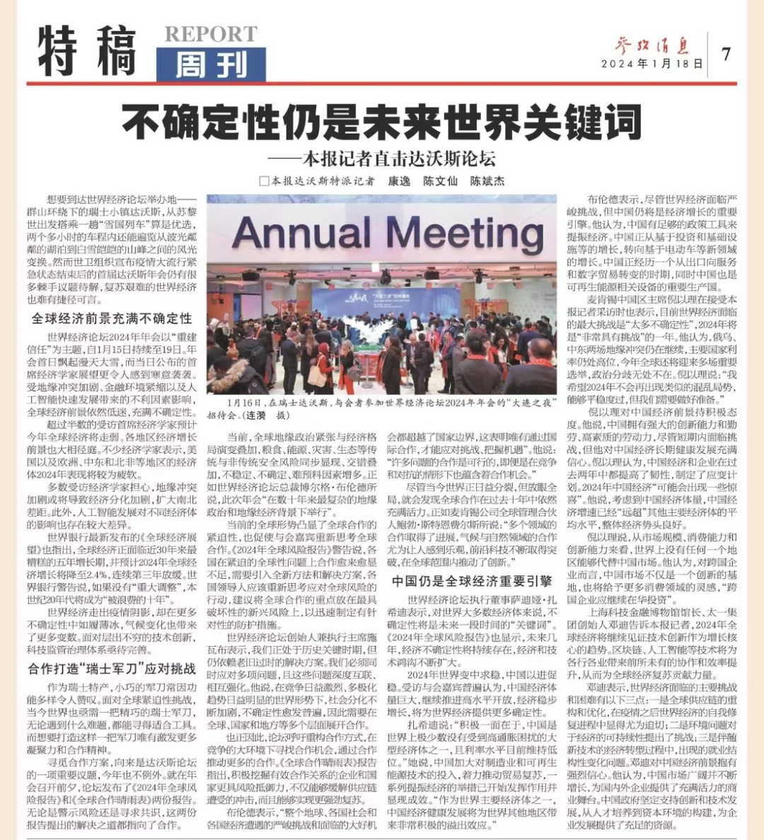 《参考消息》2024年1月18日特稿《不确定性仍是未来世界关键词-直击达沃斯论坛》作者:达沃斯特派记者 康逸 陈文仙 陈斌杰