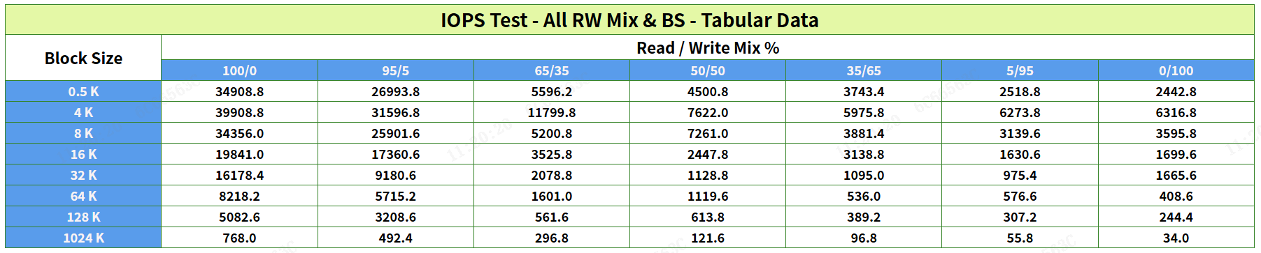 IOPS测试通常包括7种读写混合比例(从100%读到100%写)和8种块大小(从0.5KB到1024KB)。