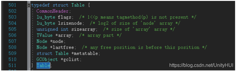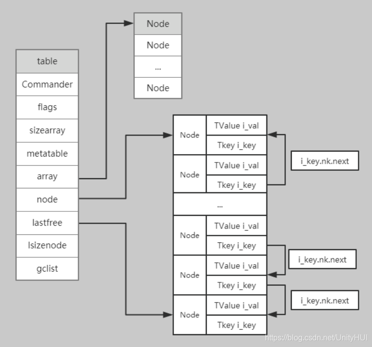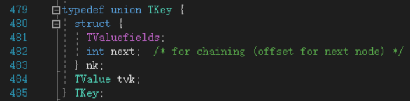 下面是表中结点的数据类型。从一个Node结点中包含一个key 和 value,vlaue就是通用数据类型 ,而key是一个Union类型,一般情况下,union结构是用来以一种比较省内存的方式来表示多种类型的,在某个时刻该数据类型只会是其中的一个类型,这种数据结构在Lua中很常见 ,而next是用于标识下一个结点Node的位置,它是一个相对于当前结点位置的偏移量