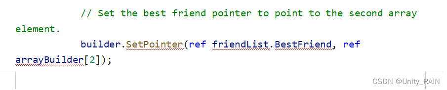 如果你要存数组到BlobAsset,可以使用BlobArray来处理。数组数据内部基于索引的偏移来进行每个元素的定位。将数组存入到BlobAsset的代码如下:
