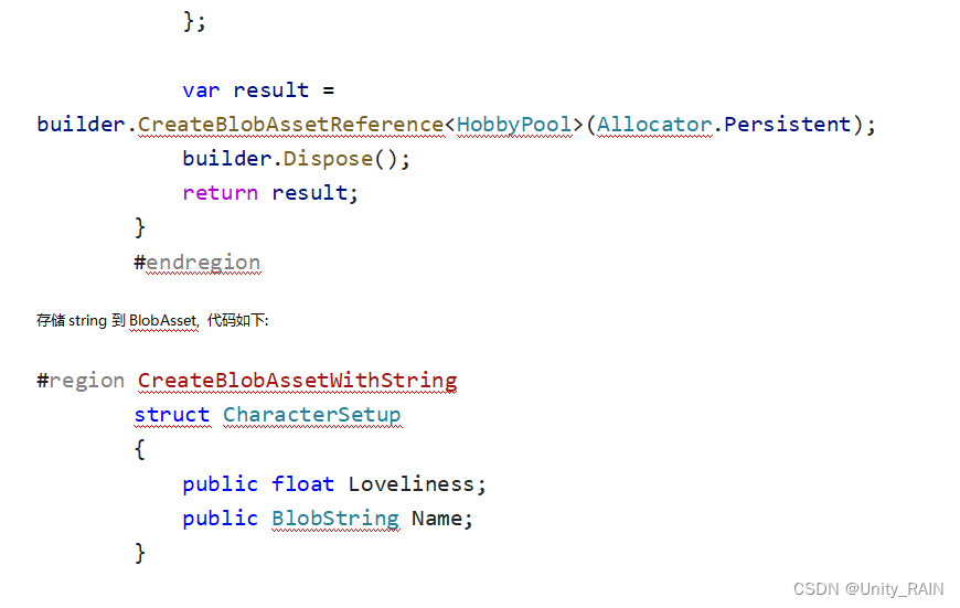 BlobAsset不支持如:数组, string等其它的托管对象(垃圾回收器可以回收的为托管对象),而且运行的时候不允许改变里面的数据内容。BlobAsset为了更快的加载,他只会包含传值的类型,不能包含对内部的引用与内部指针。BlobAsset除了支持标准的值类型(float, int等)以外它还支持三种特殊的类型: BlobArray, BlobPtr, BlobString。如果BlobAsest包含内部指针,编译器会报错。使用BlobAsset主要注意以下几个方面: