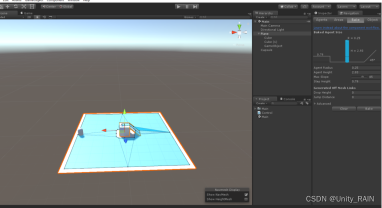 首先我们要用unity的导航网格组件,我们就需要烘焙场景,然后根据烘焙出来的数据,才能进行具体寻路,比如什么地方可以走,什么地方不能走,爬坡的最大高度等等,所以你怎么烘焙你的场景,就会出现怎么样的寻路地图。然后我们让需要寻路的物体挂载一个寻路组件就可以了。这就是原理了。好,我们先来看看怎么烘焙场景。