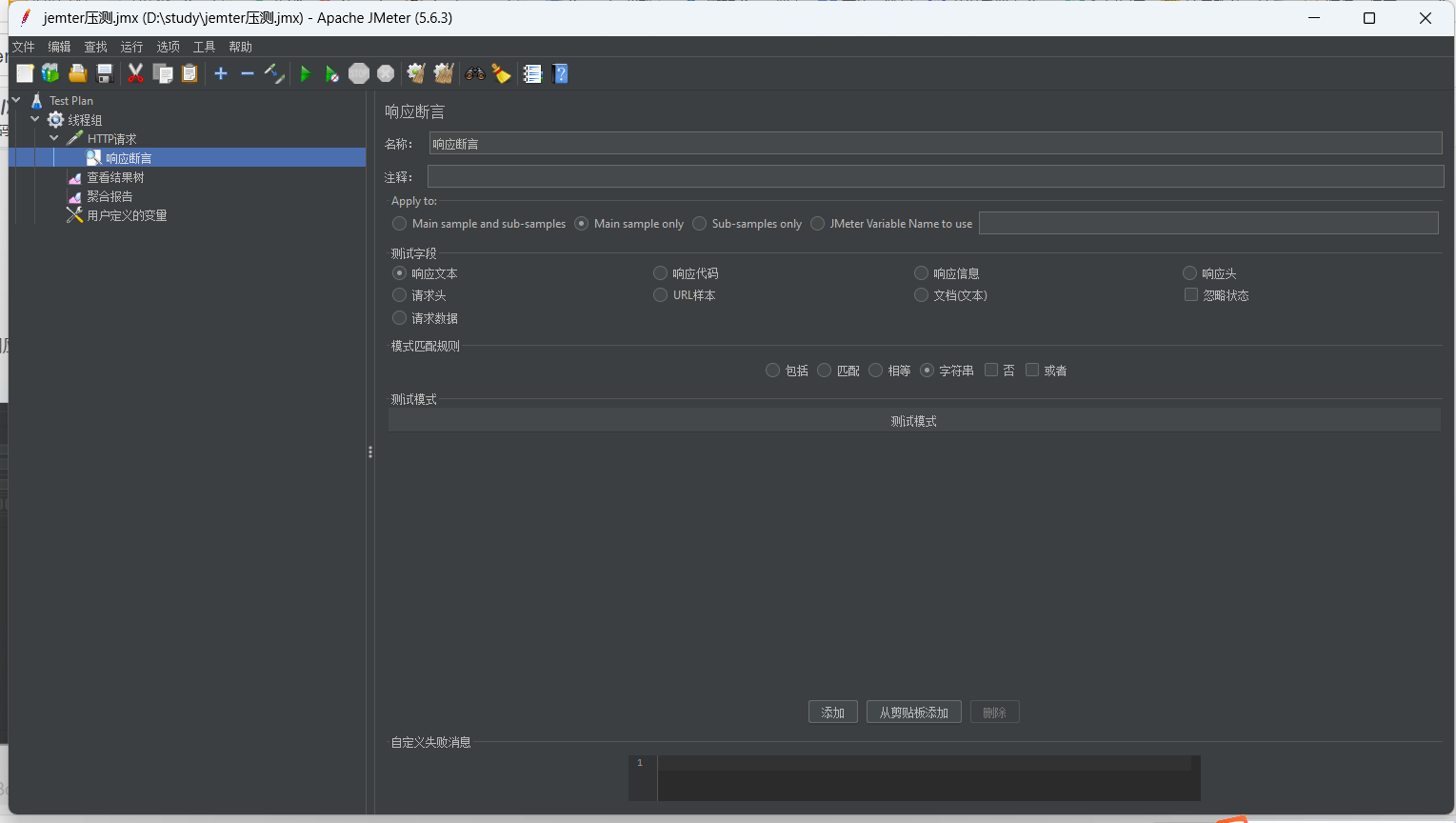 - 右键 HTTP 请求 → 添加 → 断言 → 响应断言