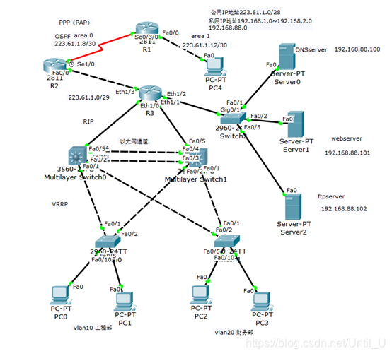 Allina公司网络拓扑结构如下图所示,Allina公司做网络规划,向电信运营商申请了223.61.1.0/28的IP段。分成三段223.61.1.0/29、223.61.1.8/30和223.61.1.12/30。公司采用三台路由器,两台三层交换机做核心,并做负载。并且有三台二层交换机,分别连接VLAN10,VLAN20和服务器。实现不同网络互联,R1和R2之间做PPP认证,在R3上做NAPT私有地址的转换,并且设置ACL只允许VLAN10和VLAN20访问服务器资源。交换机之间要求作虚拟网关、负载均衡和配置PVST。最后做总的测试。