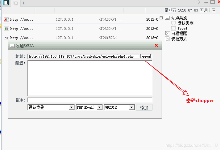 上传php文件,打开中国菜刀软件(网上直接搜下载就好了),添加php1.php的网页链接,输入密码。