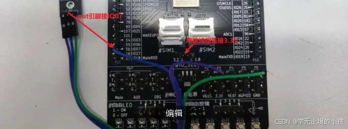 使用跳线帽将IO_SEL连接3.3V,给引脚供3.3V的电。dht11模块的out引脚连接780E开发板的一个引脚,具体哪个可以自己更改,这个demo中使用的是7号引脚。具体实物图如下: