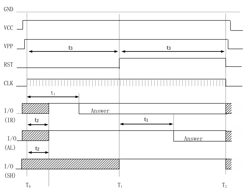 时钟信号在T0时刻加到CLK触点,I/O总线在时钟信号加到CLK触点200个时钟周期(T0时刻之后的t2时间段)之内应该处于高阻状态;