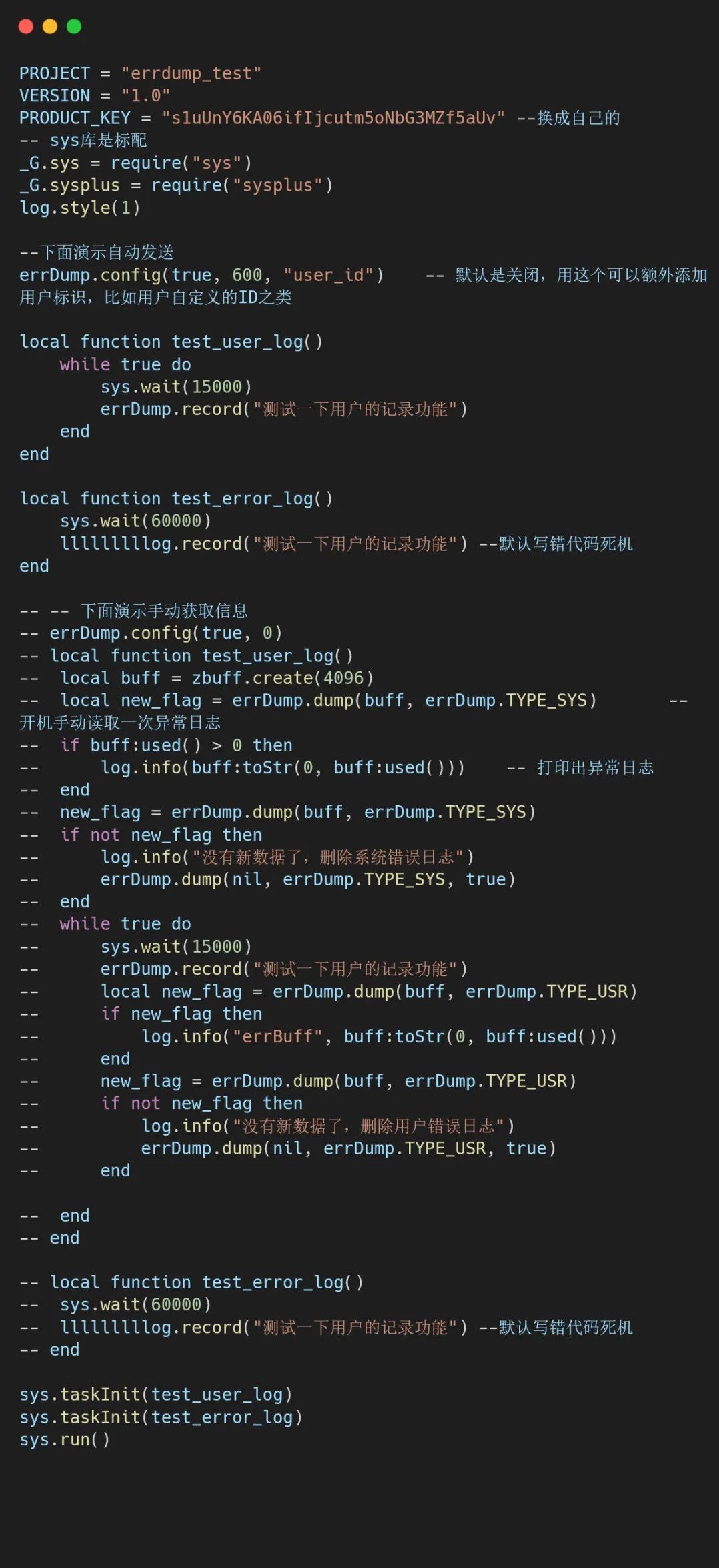 LuatOS-Air错误日志上报功能模块名叫:errDump,errDump对“量产投放市场的设备,远程调试初步定位问题”至关重要,强烈建议用户一定要使用此功能。