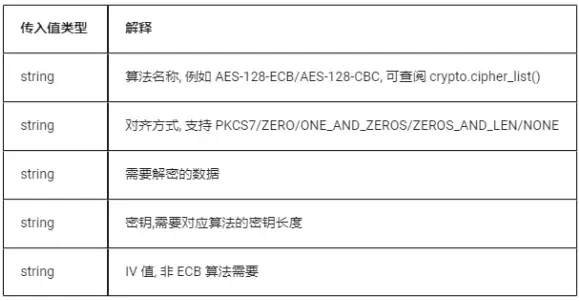 5.14 crypto.cipher_decrypt(type, padding, str, key, iv)