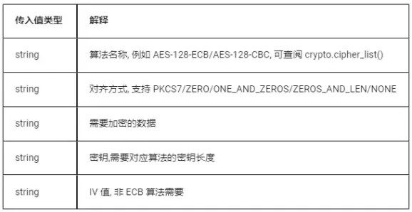 5.13 crypto.cipher_encrypt(type, padding, str, key, iv)