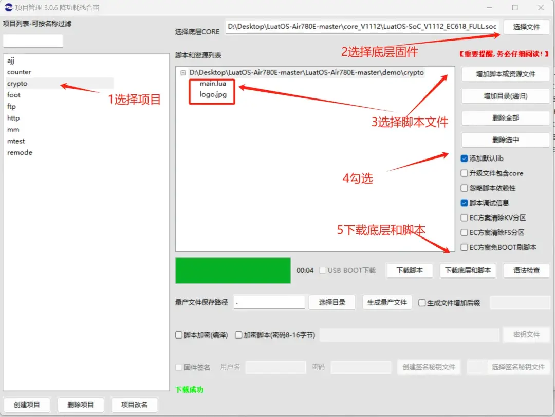 选择 Air780E 板子对应的底层 core 和刚改的 main.lua 脚本文件.下载到板子中.