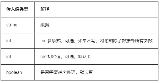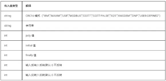5.15 crypto.crc16(method, data, poly, initial, finally, inReversem outReverse)