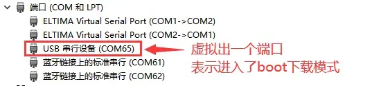 判断是否进入 BOOT 模式:模块上电,此时在电脑的设备管理器中,查看串口设备, 会出现一个端口表示进入了 BOOT 下载模式,如下图所示: