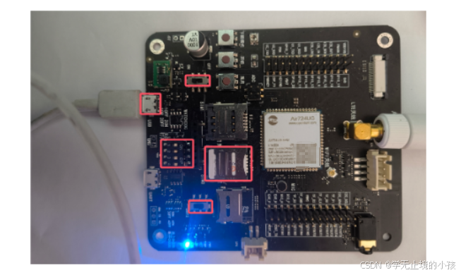 USB 数据线插入 USB 口,另一端与电脑相连,拨码开关全部拨到 ON,串口切换开关选择 UART1,USB 供电的 4V 对应开关拨至 ON 档,SIM 卡放到 SIM 卡槽中锁紧,如下图所示。