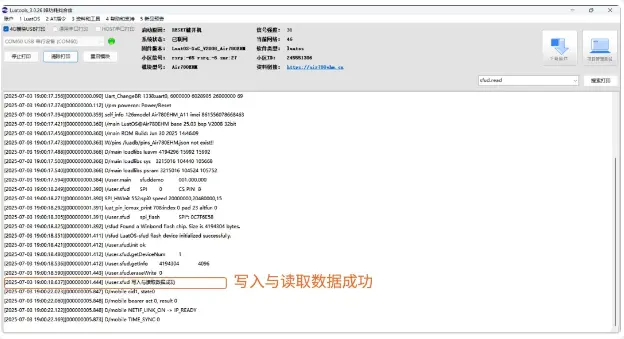 Air780EHM核心板通过LuaTools烧录内核固件和demo脚本代码。烧录成功后开机运行,通过LuaTools日志查看运行结果。