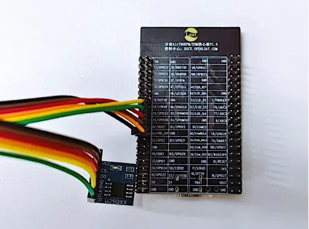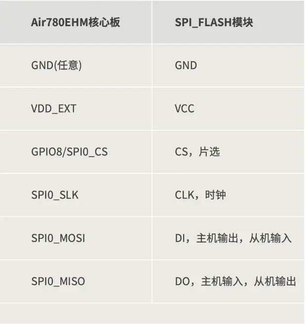 Air780EHM核心板通过杜邦线和SPI Flash模块连接,对应管脚接线方式如下图表所示: