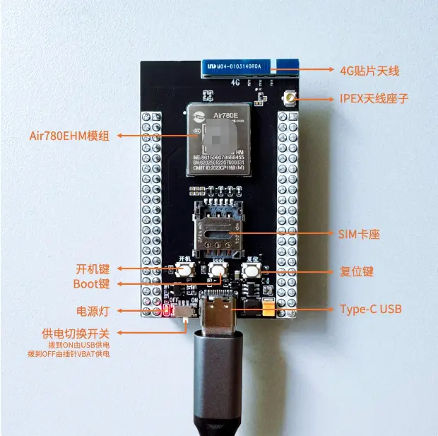 Air780EHM核心板通过Type-C USB数据线连接电脑;支持USB口供电,使用时请将USB旁边的开关拨到ON一端。