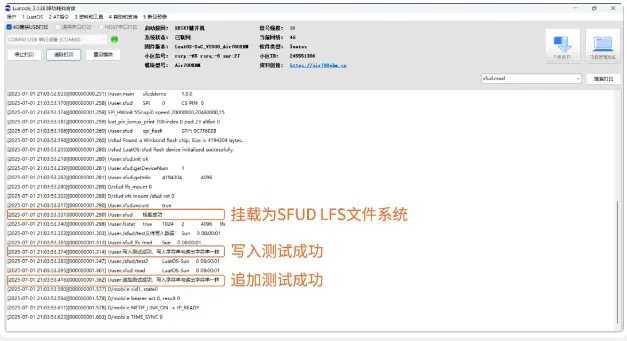 日志输出显示,文件系统挂载过程顺利完成,且测试文件读写、内容追加、文件删除等核心操作均能稳定执行,整个交互过程无异常报错信息,充分验证了SFUD LFS文件系统在嵌入式存储场景下的功能完整性。